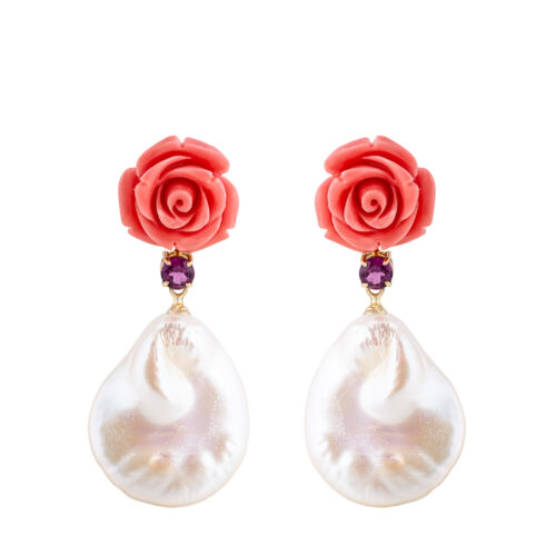 Brinco Ouro Amarelo Flor Coral Pérolas keshi e Rodolitas