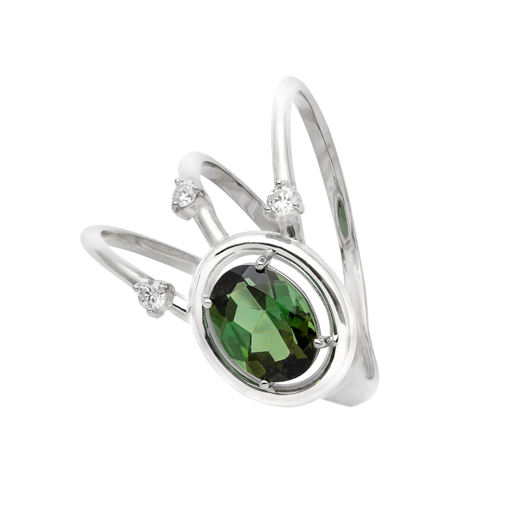 Especificações: Anel ouro branco turmalina verde 6×8 e diamantes 0,09 ct