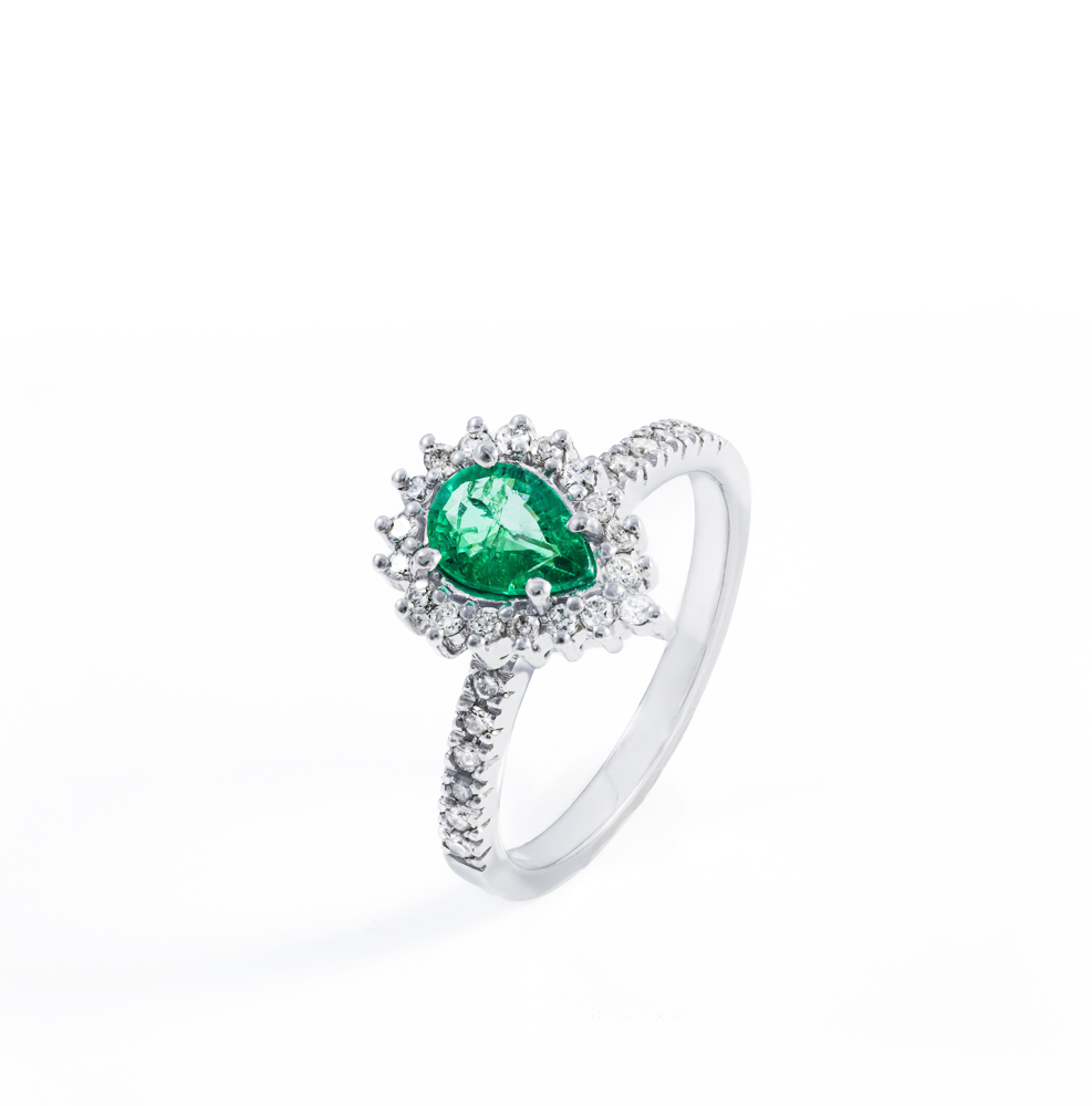 Especificações: Anel ouro branco com esmeralda gota 0,57 ct e diamantes 0,31 ct