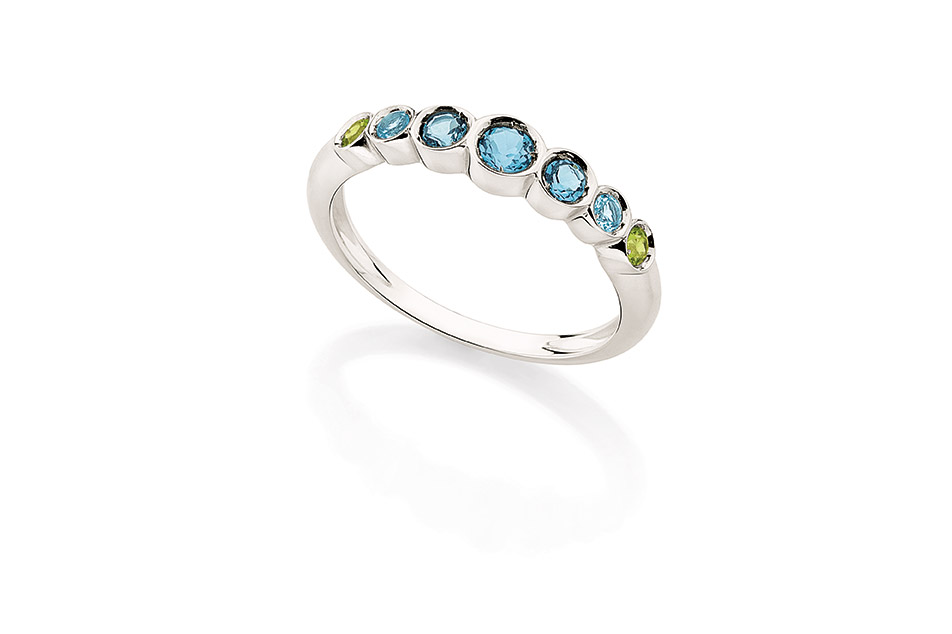 Especificações: Anel ouro branco, topázios azuis e peridotos.