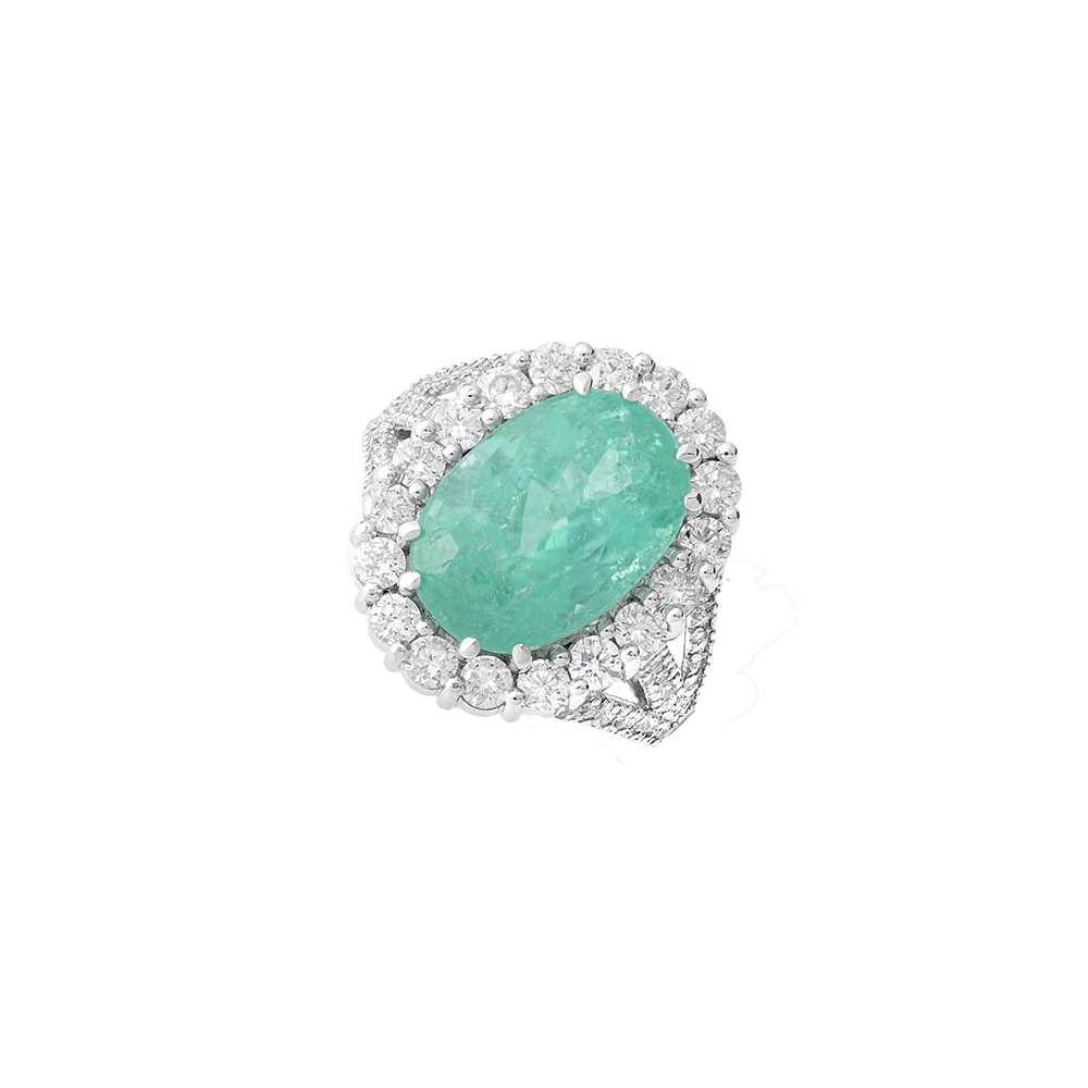 Anel ouro branco turmalina paraíba oval 6,65 quilates, diamantes 1,12 quilates