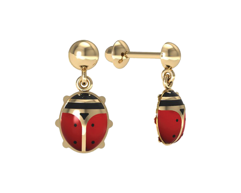 Brinco ouro amarelo infantil joaninha esmaltado, pendurado, tarraxa baby