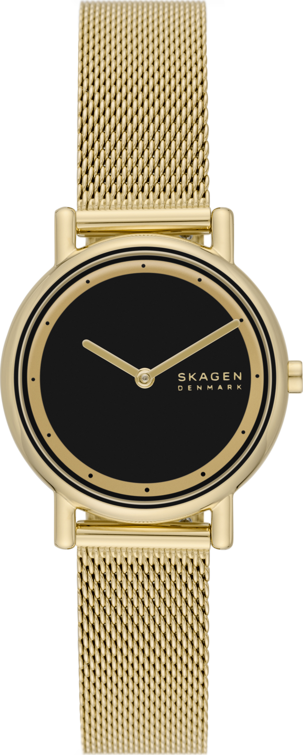 Especificações: Relógio aço dourado analógico, mostrador preto, pulseira dourada.